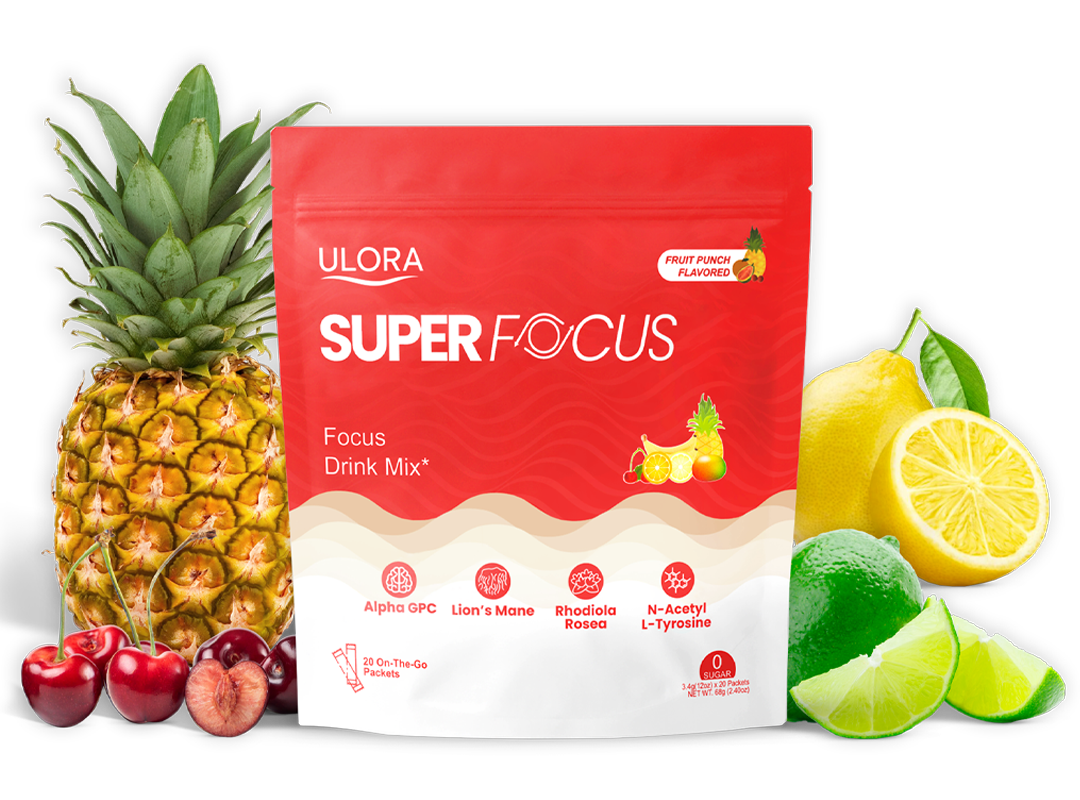 Ulora Superfocus is a daily drink mix made for ADHD brains. It combines L Tyrosine, Alpha GPC, Lion’s Mane, and Rhodiola to boost focus, motivation, and mental clarity without stimulants, crashes, or jitters.