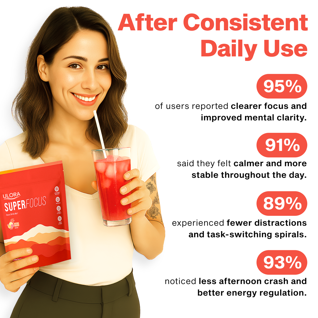 Ulora Superfocus is a daily drink mix made for ADHD brains. It combines L Tyrosine, Alpha GPC, Lion’s Mane, and Rhodiola to boost focus, motivation, and mental clarity without stimulants, crashes, or jitters.