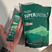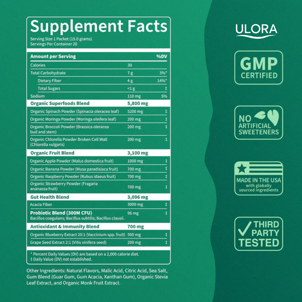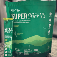 Ulora Greens is a daily drink mix that supports the gut to reduce bloating, puffiness, and brain fog! It helps flush out built-up waste so you feel lighter and more energized.