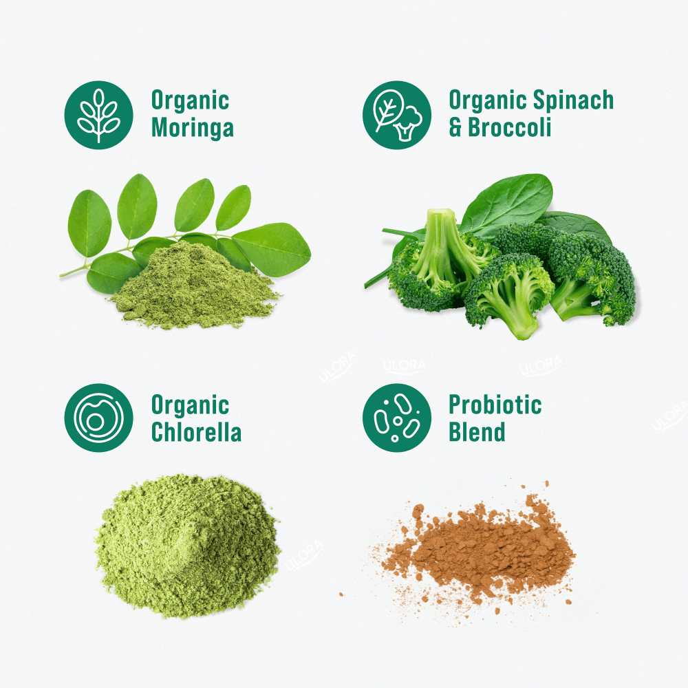 Spinach Powder, Moringa Powder, Broccoli Powder, Chlorella Powder, Apple Powder, Banana Powder, Raspberry Powder, Strawberry Powder, Acacia Fiber, Bacillus coagulans, Bacillus subtilis, Bacillus clausii, Blueberry Extract (20:1), Grape Seed Extract (20:1)
